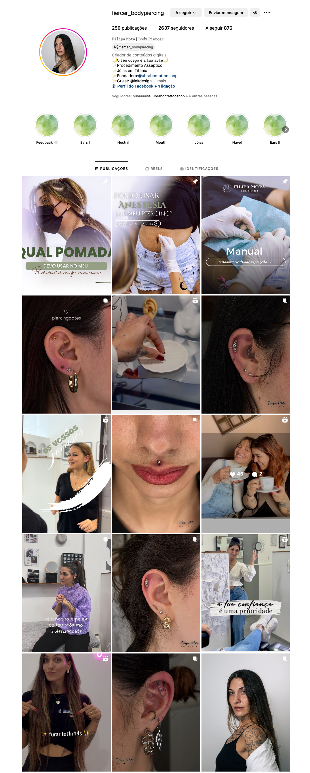 Olá, eu sou a Filipa e sou Body Piercer certificada desde 2019. Fiz vários cursos e workshops, desde biossegurança até técnicas e ângulos de perfuração.